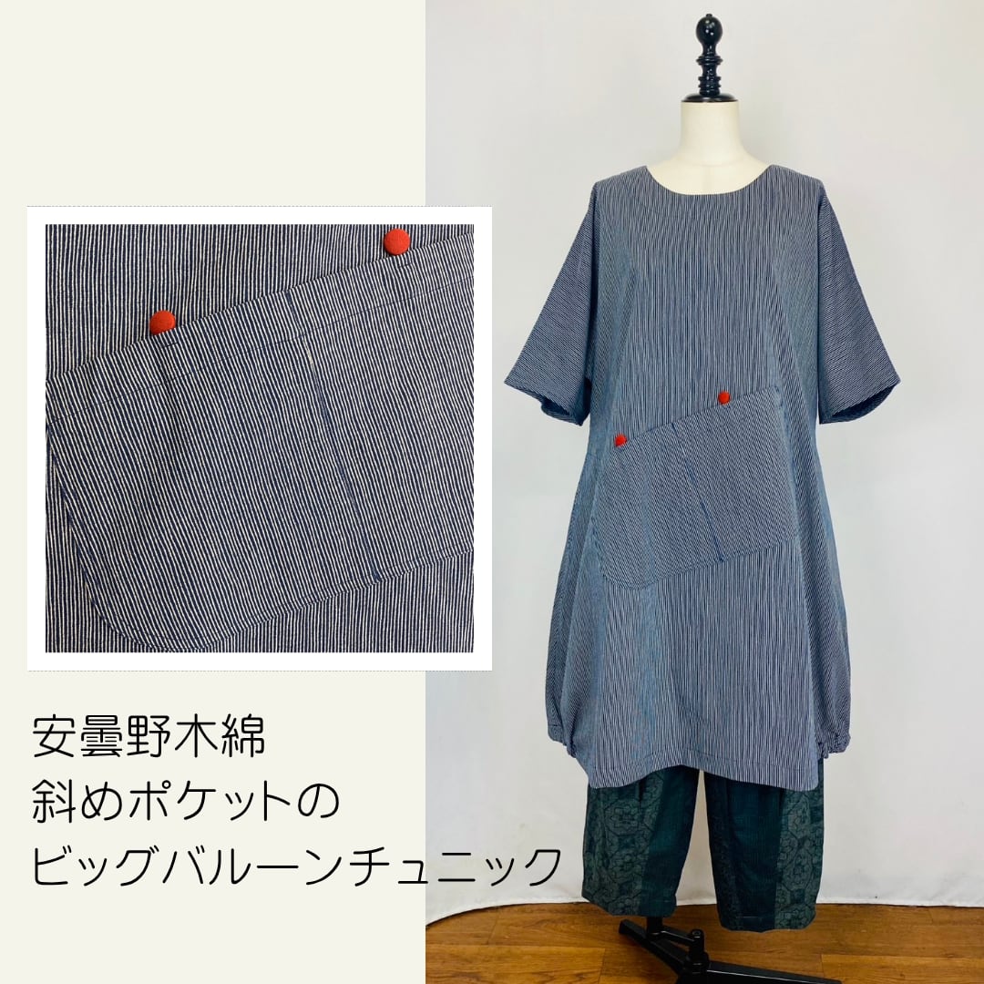 222043 斜めポケットのビッグバルーンチュニック 安曇野木綿 細縞