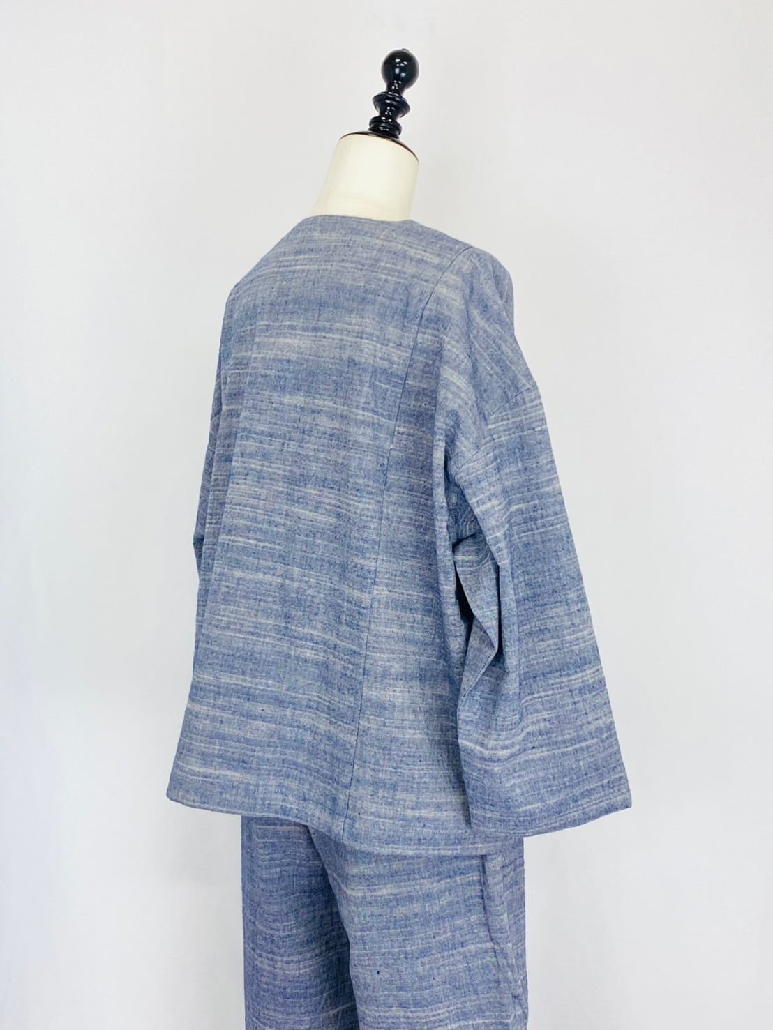 遠州織物の風合いを生かしたノーカラーショートジャケットです。