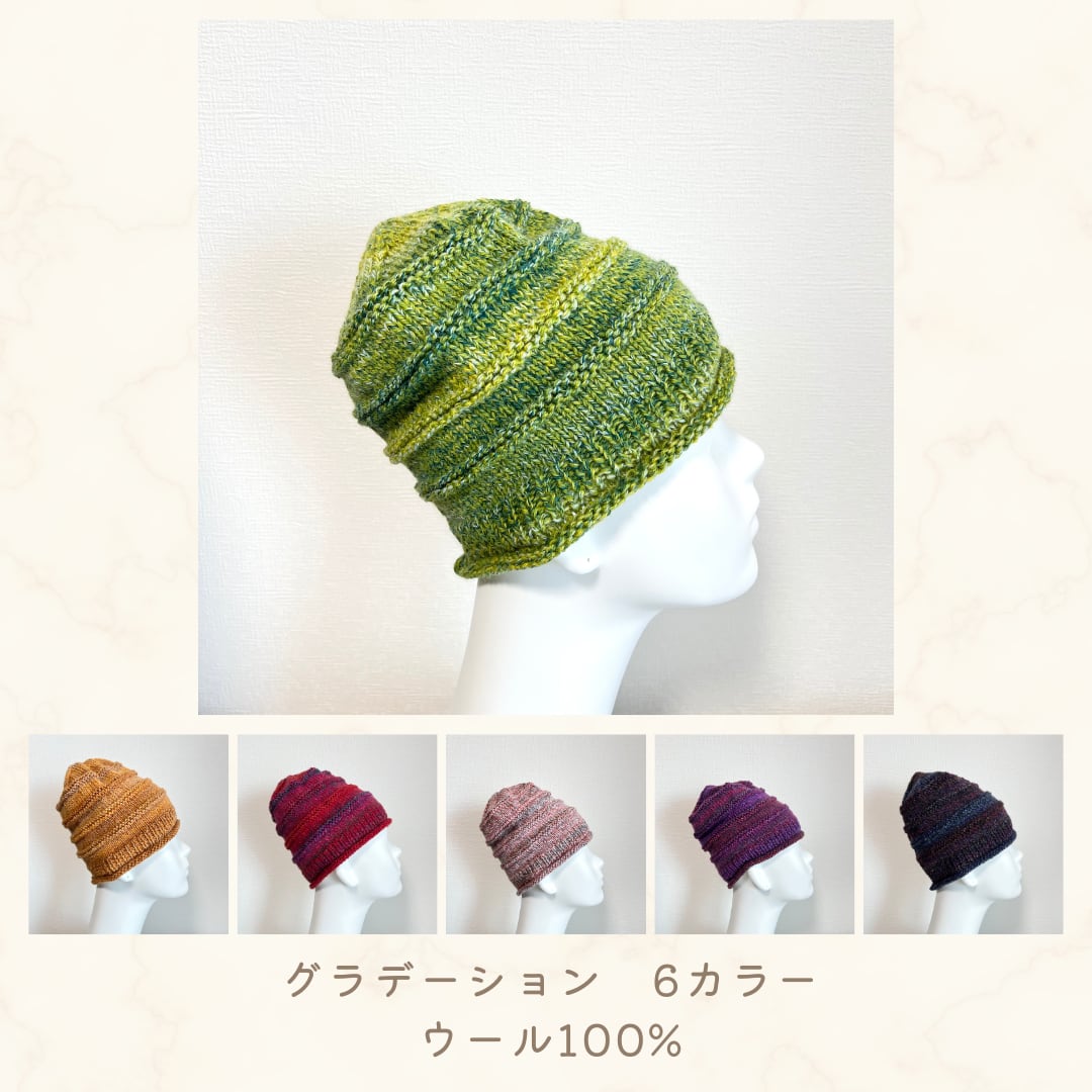<受注生産>【手編み】ウール100% グラデーションカラーの帽子 6カラー 室内帽子 お出かけ帽子 天然素材 棒針編み