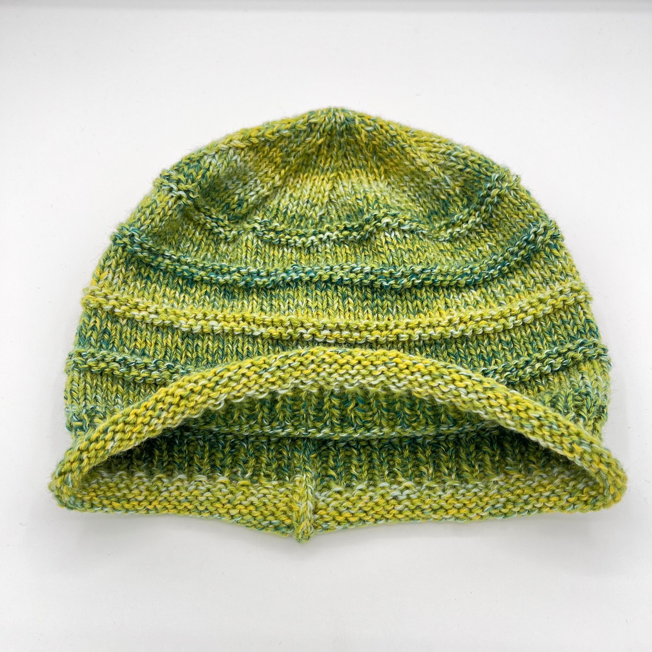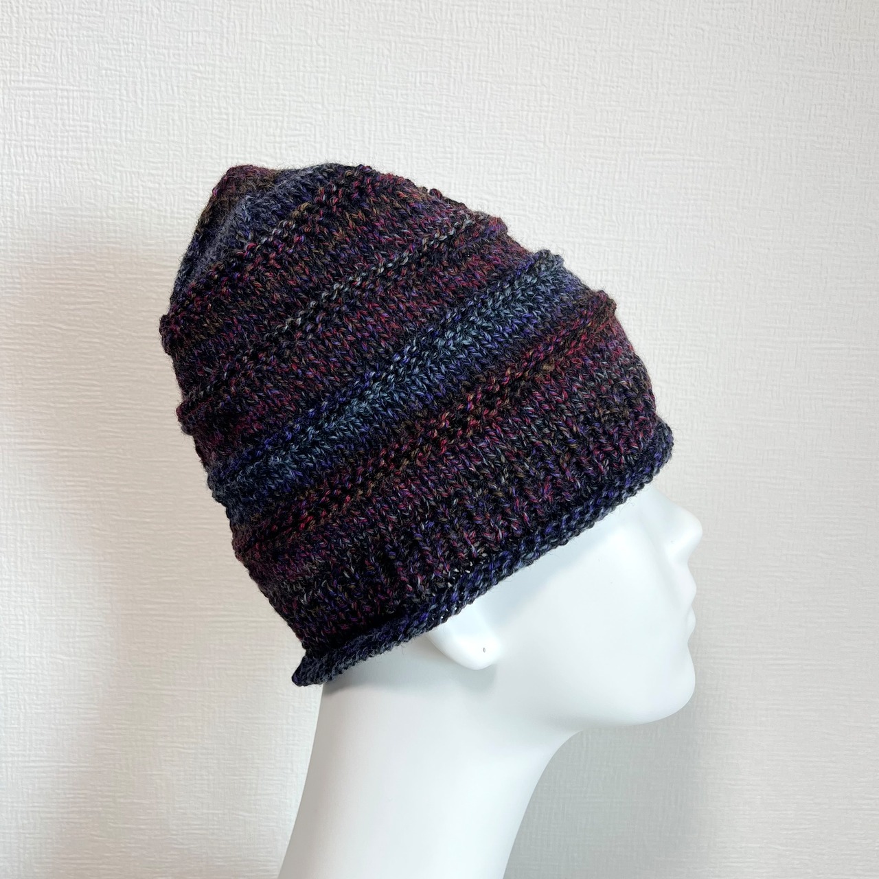 単色とグラデーションの糸を撚り合わせた毛糸を使用したニット帽です。色を楽しんでほしくて、シンプルな形に仕上げました。
