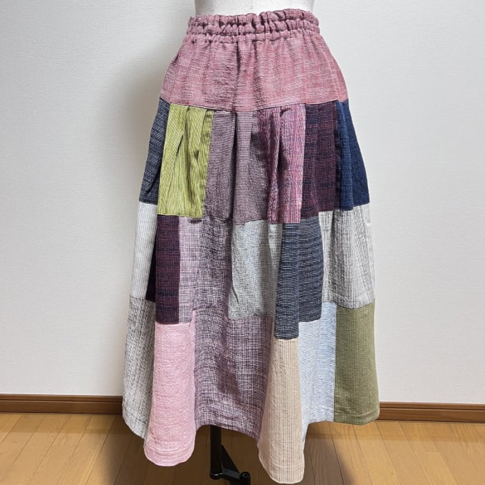 色々な遠州織物の生地をパッチワークしたティアードスカートです。