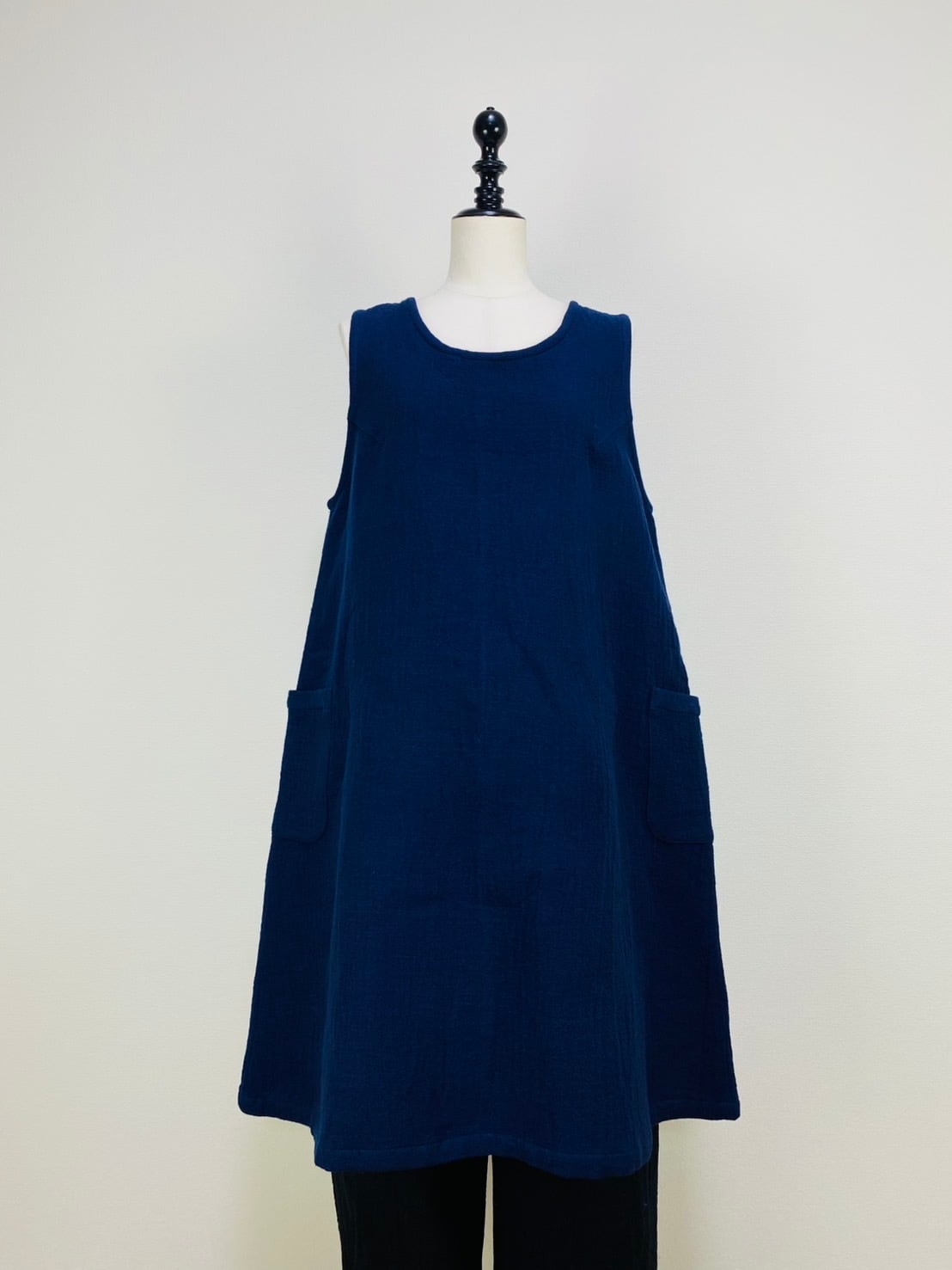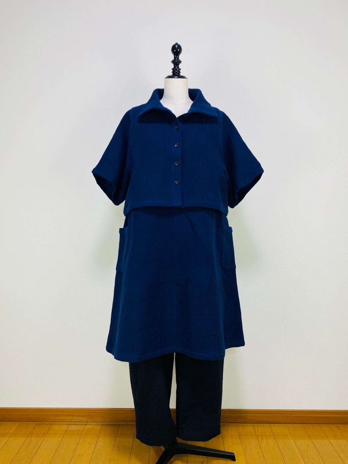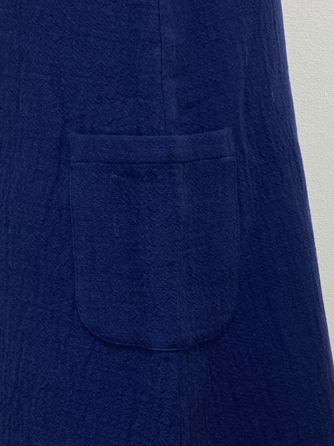 ゆったりとしたフレアーシルエットのタブリエ(短めのジャンパースカート)です。