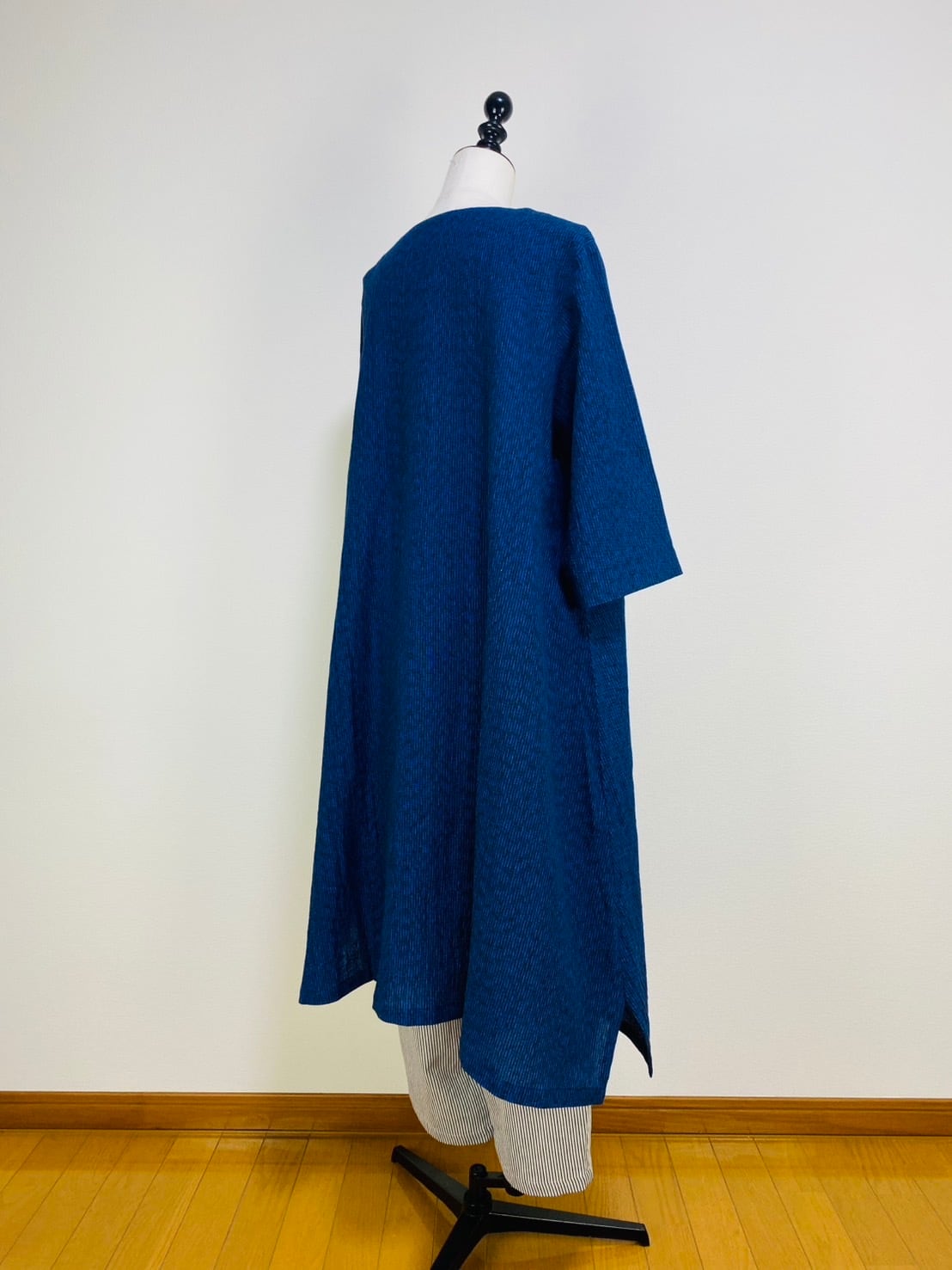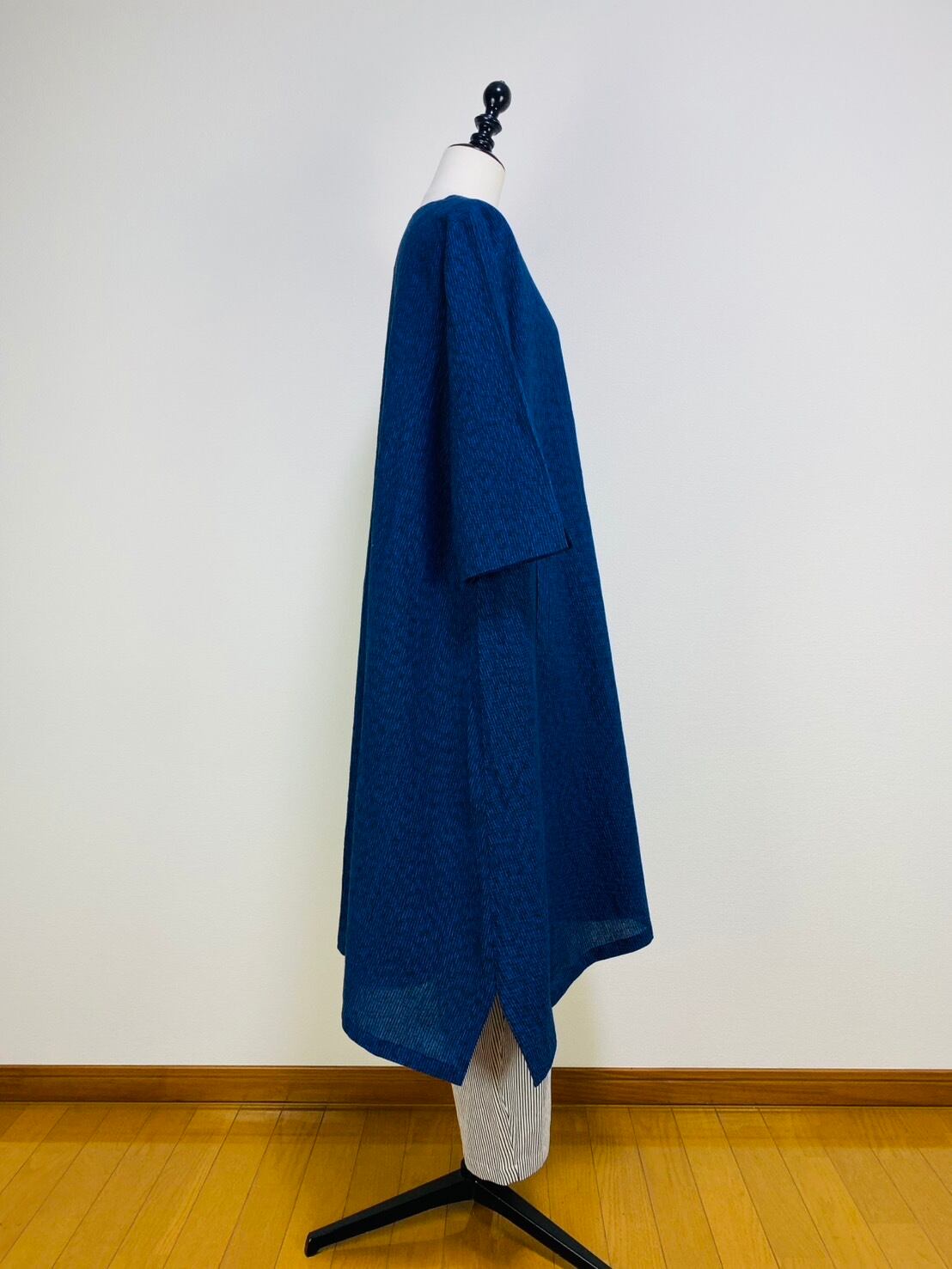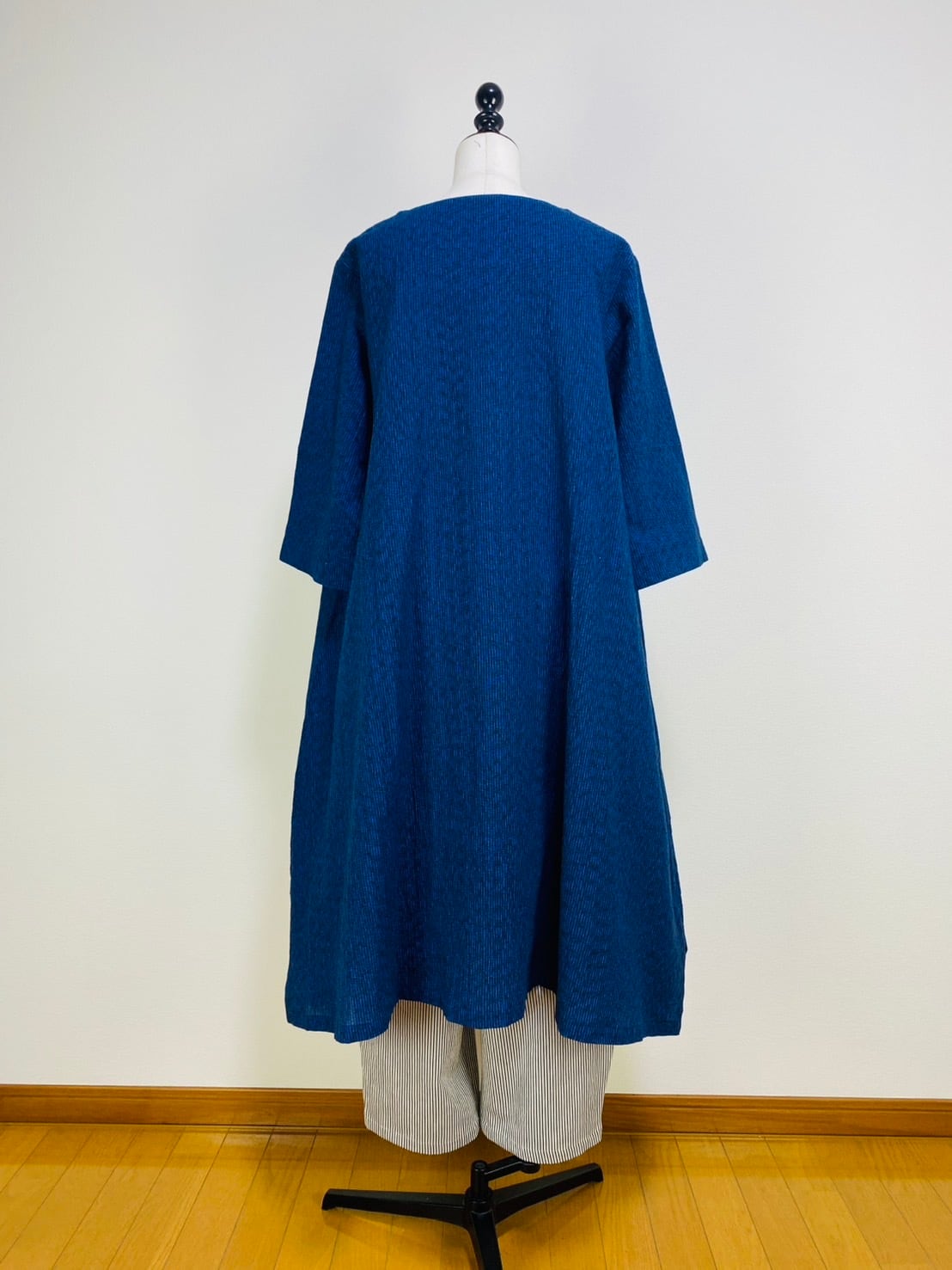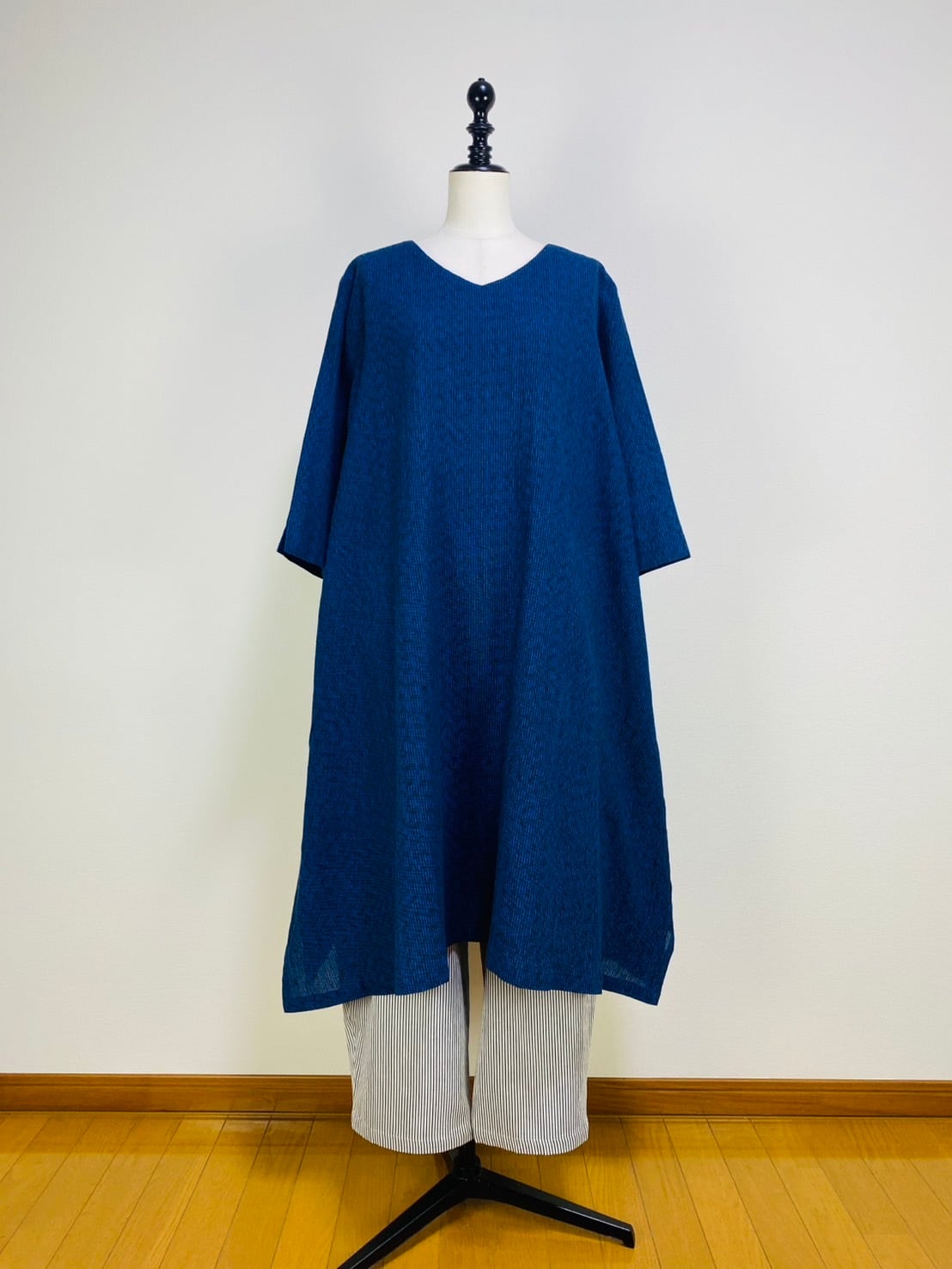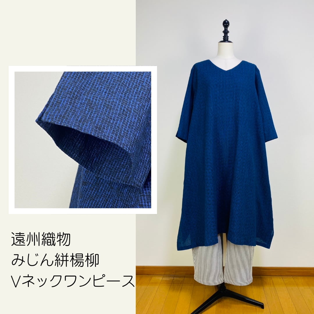 212061 Vネックの台形ワンピース 7分袖 遠州織物 みじん絣楊柳