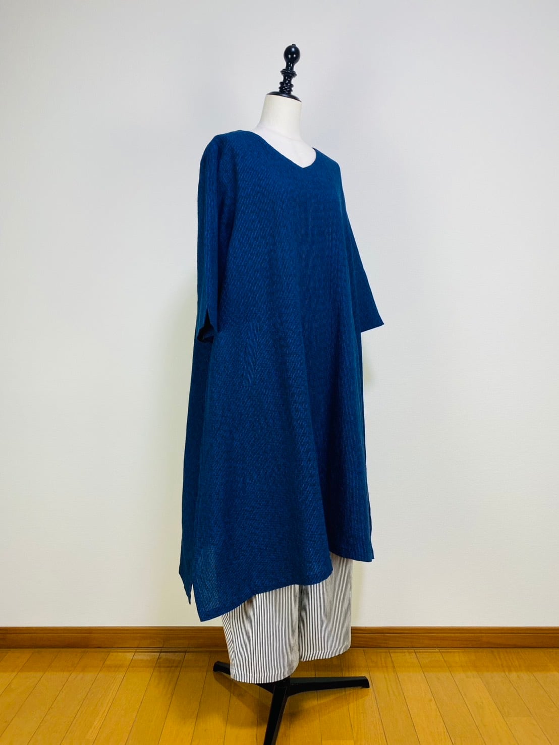 すっきりとしたVネックのシンプルなAラインのワンピースです。