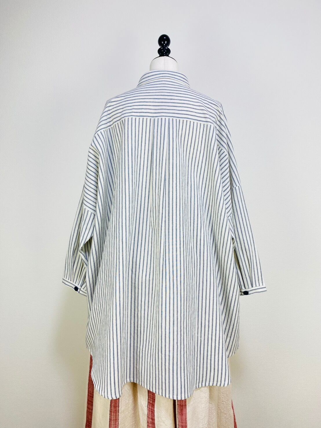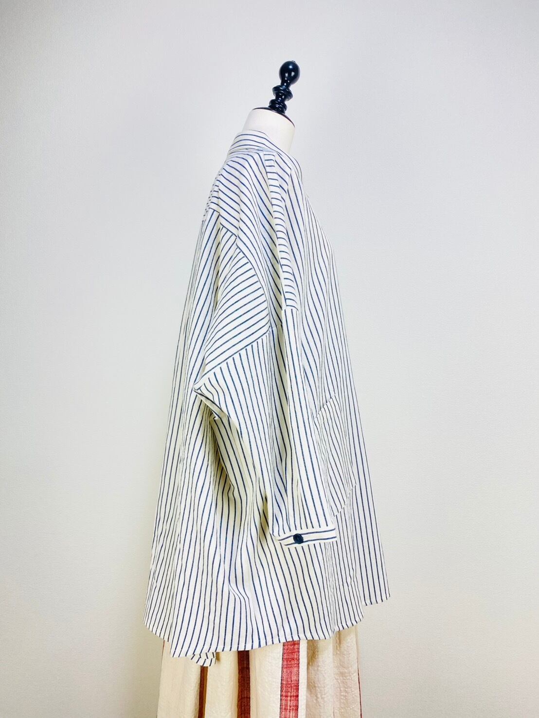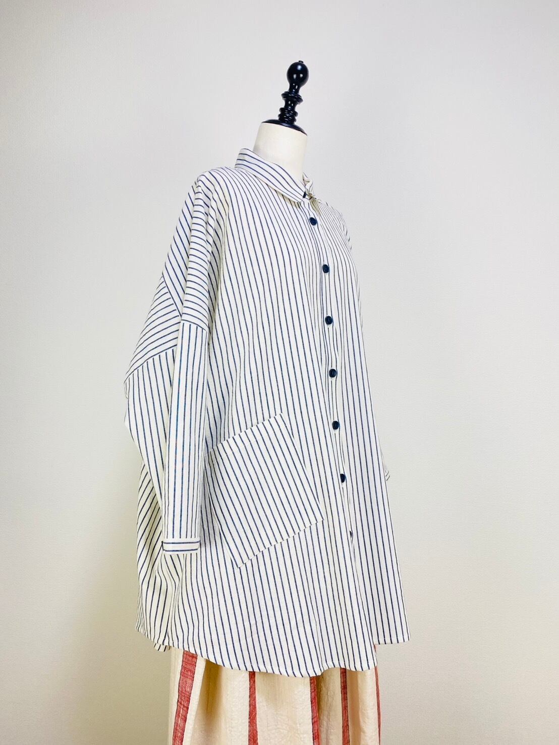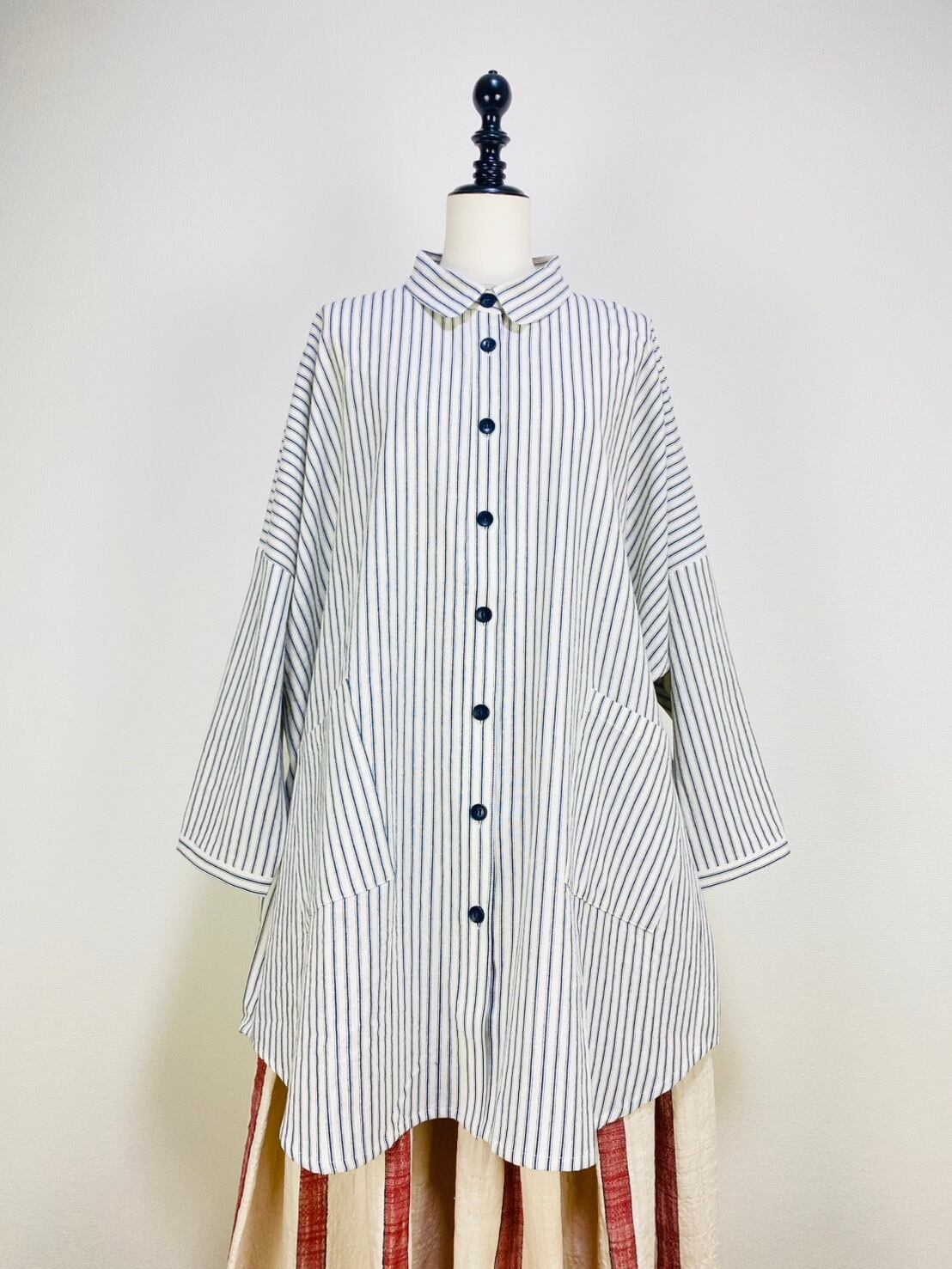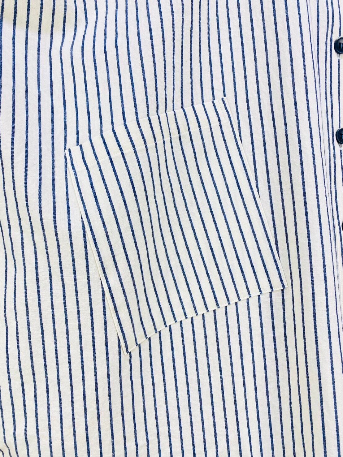 263018 貼り付けポッケのビッグブラウス 岡山産インディゴストライプ
