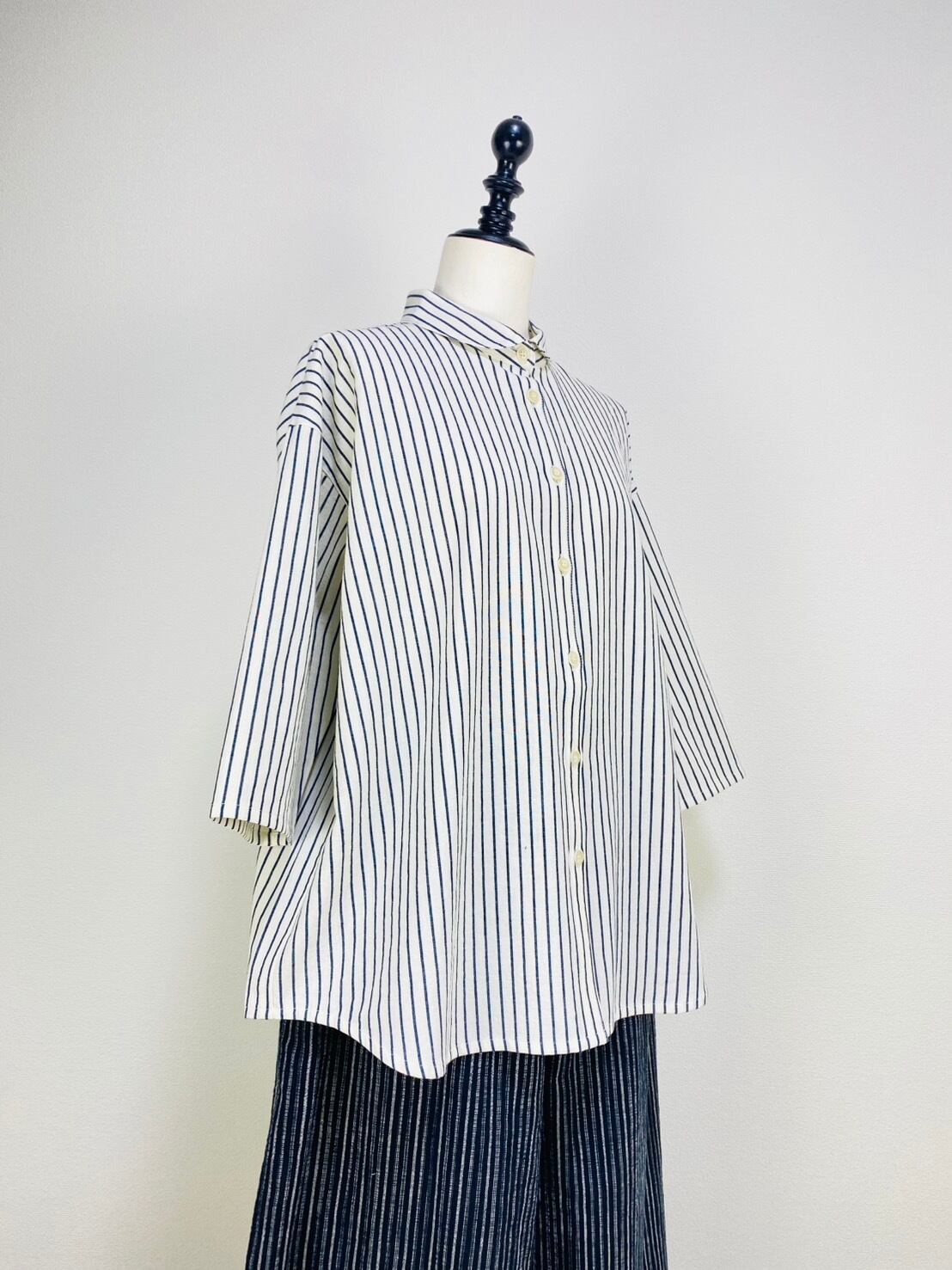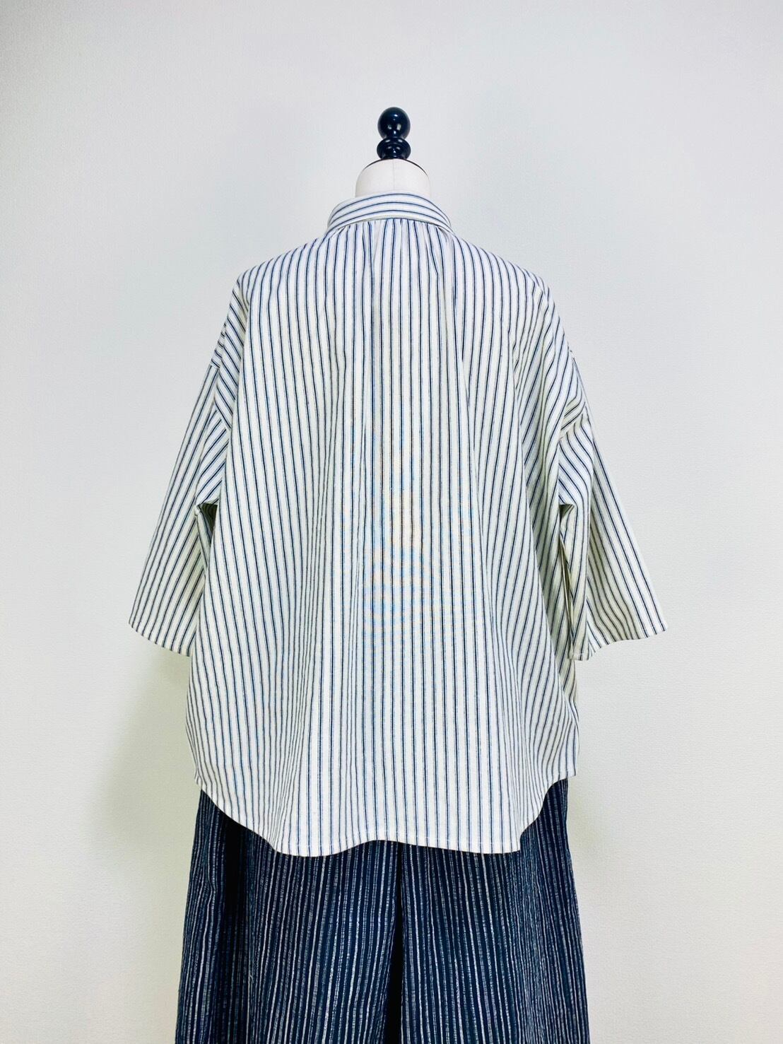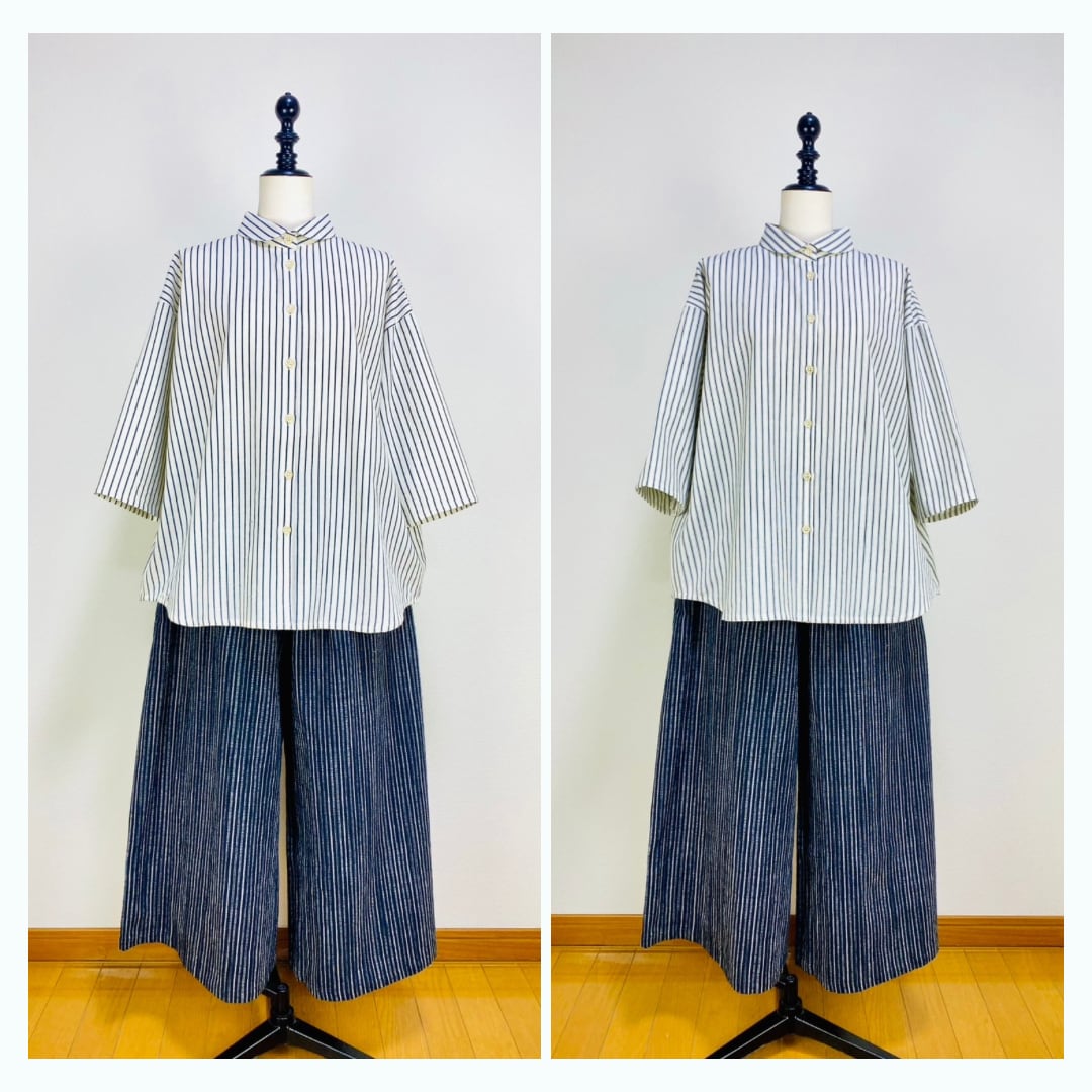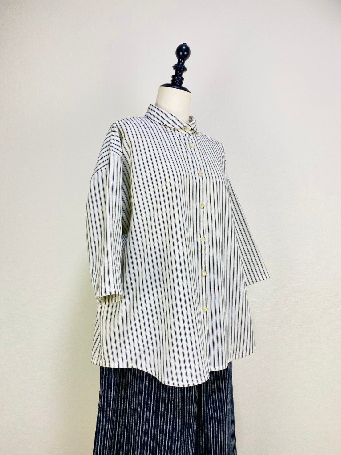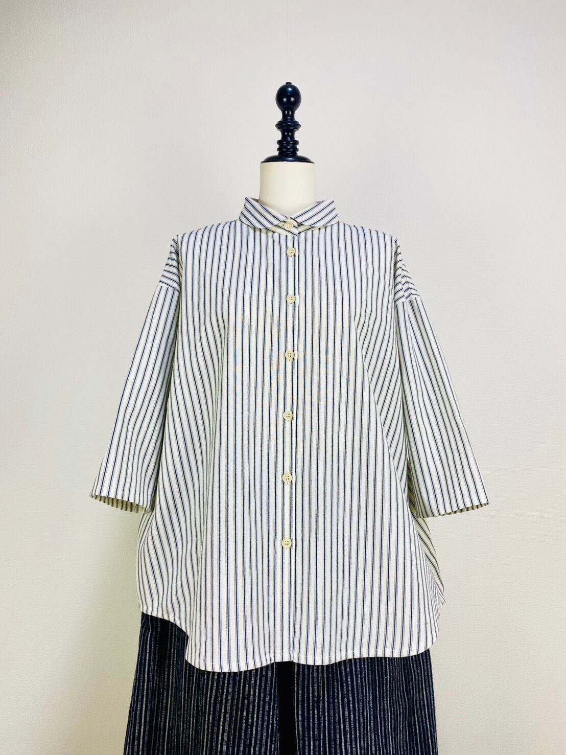 SU19108 丸襟ゆったりブラウス 7分袖 2柄 岡山インディゴストライプ