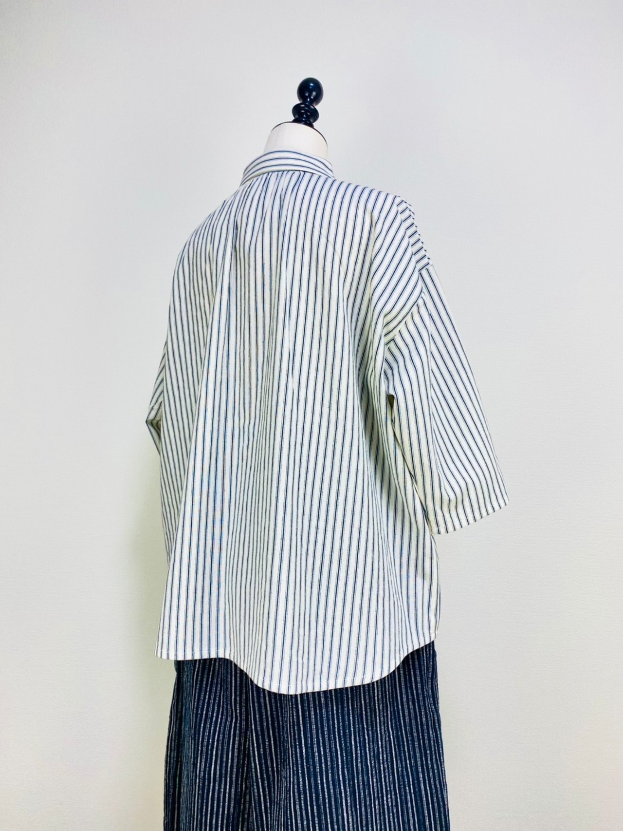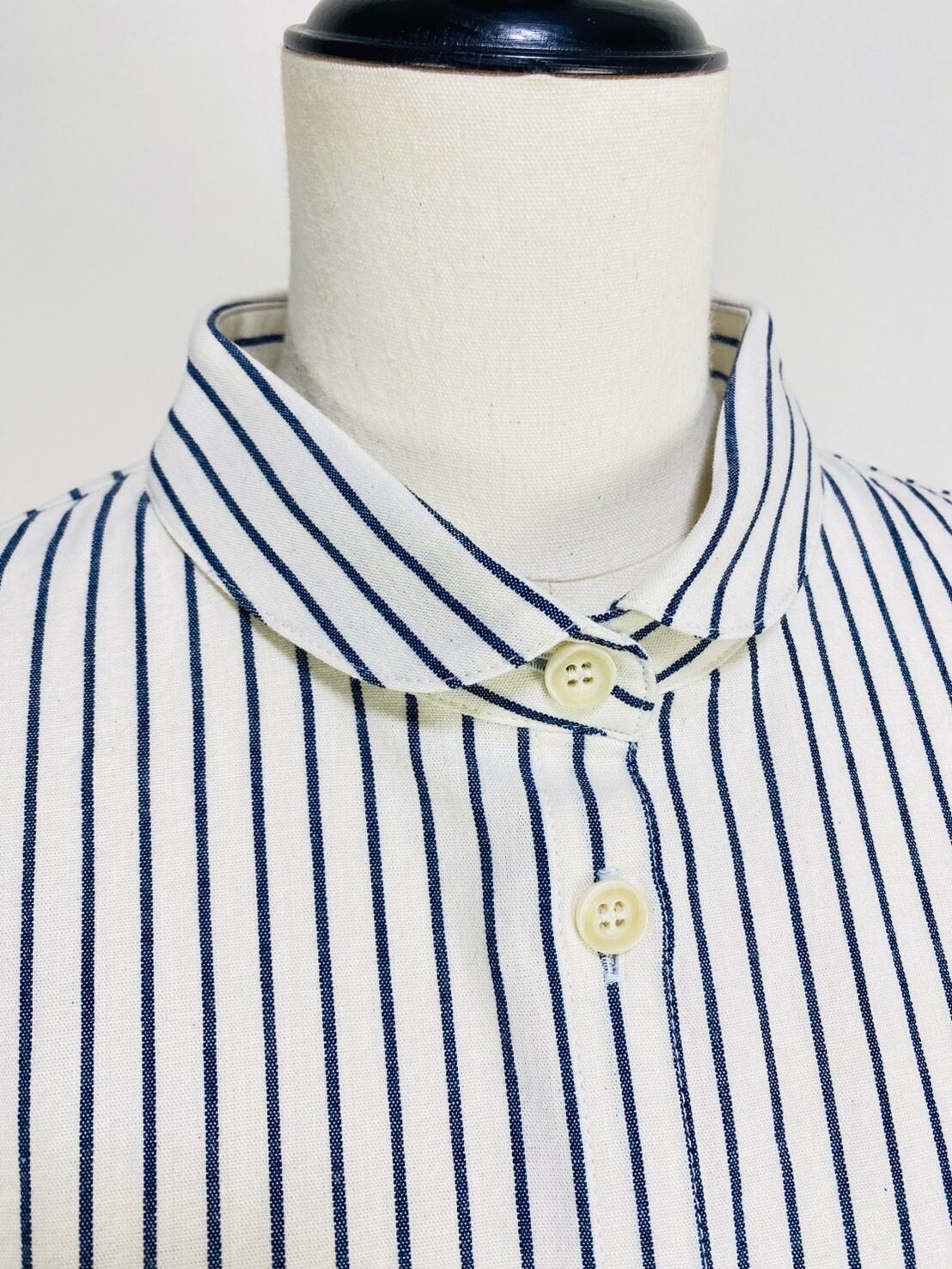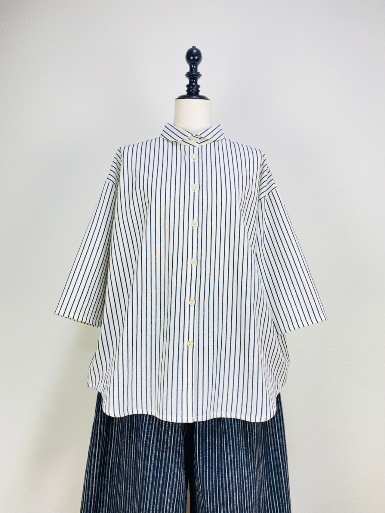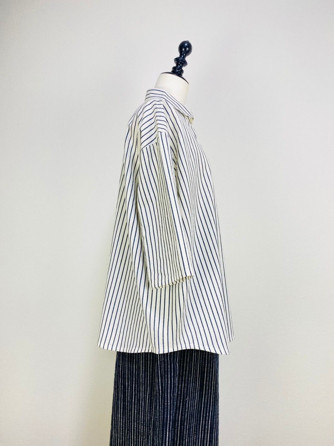 SU19108 丸襟ゆったりブラウス 7分袖 2柄 岡山インディゴストライプ