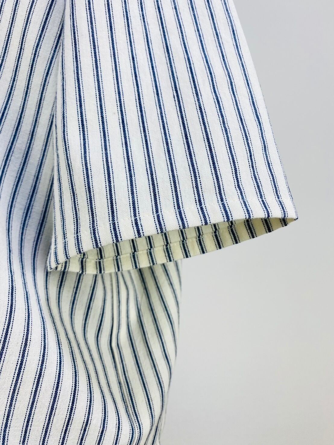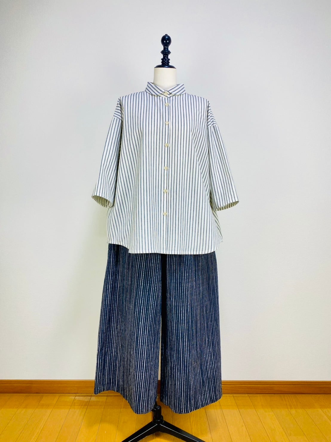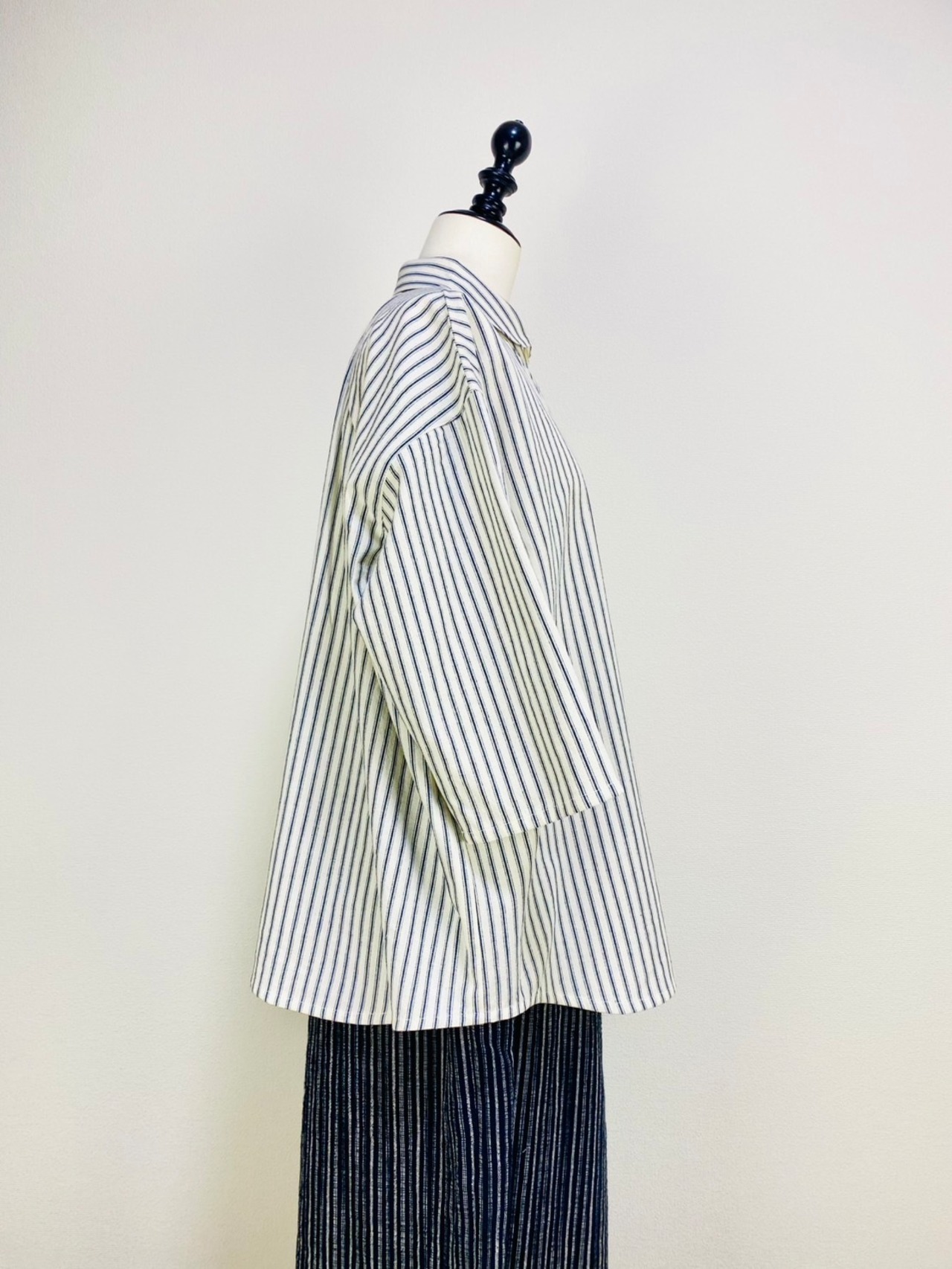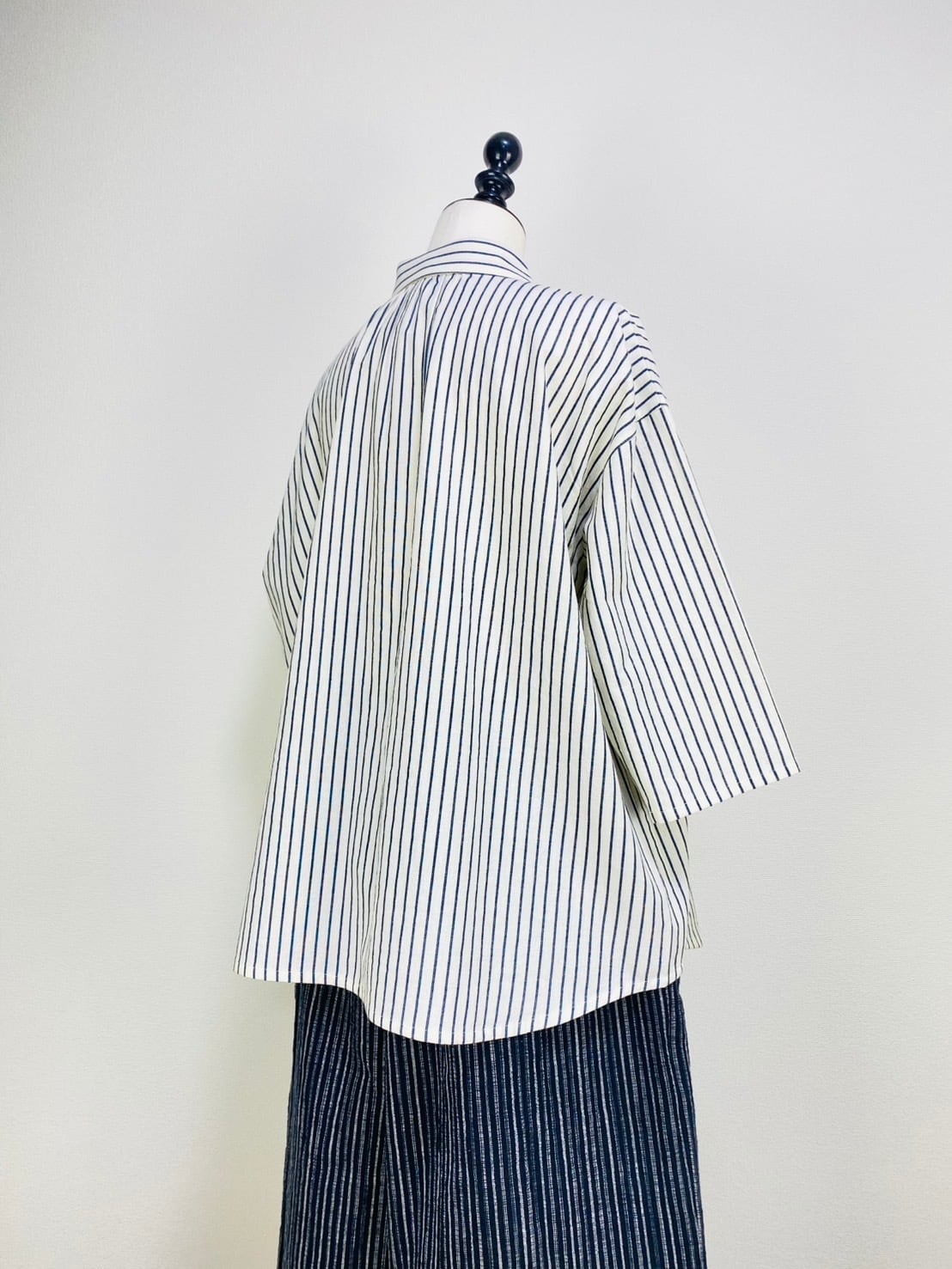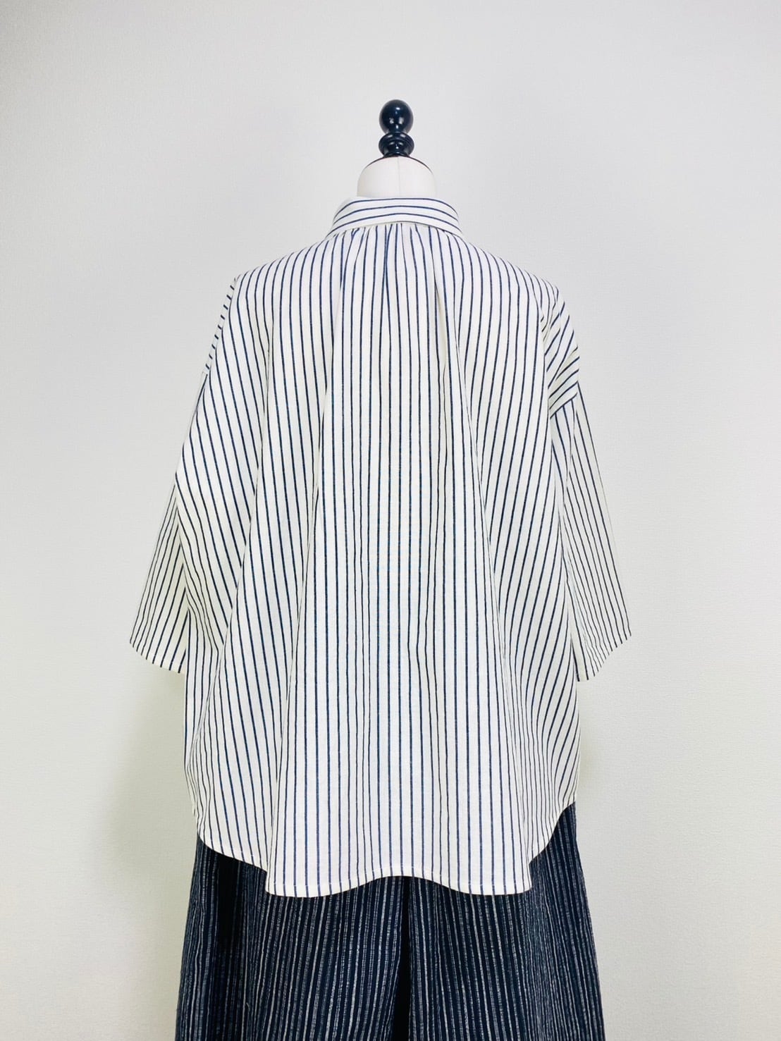 SU19108 丸襟ゆったりブラウス 7分袖 2柄 岡山インディゴストライプ