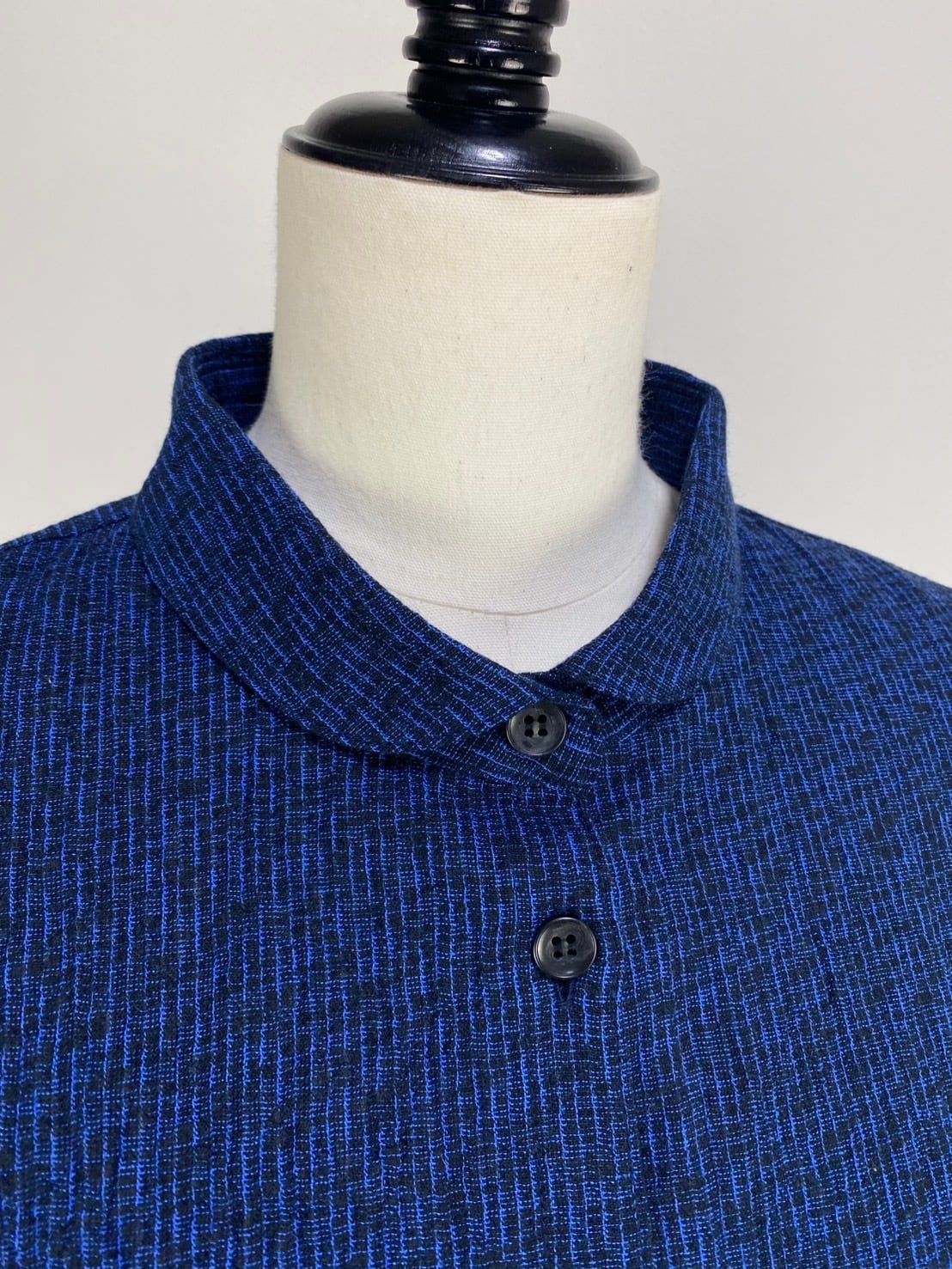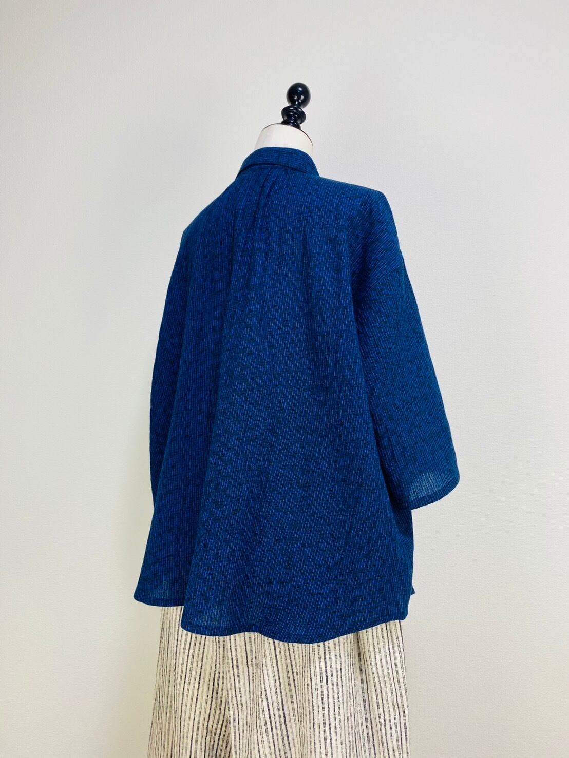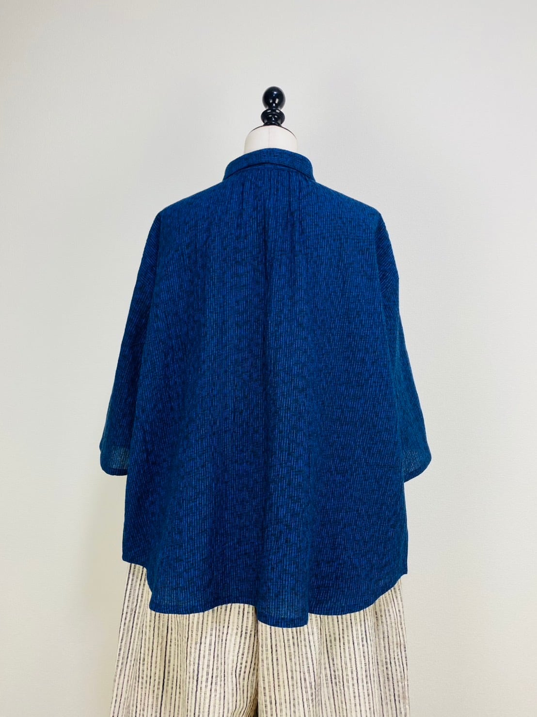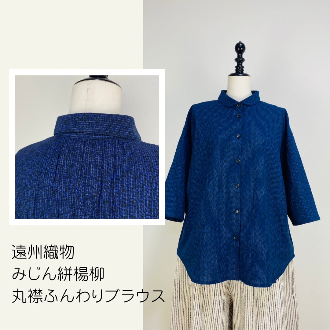 SU19101 丸襟ゆったりブラウス 遠州織物 紺 たてよこみじん絣楊柳