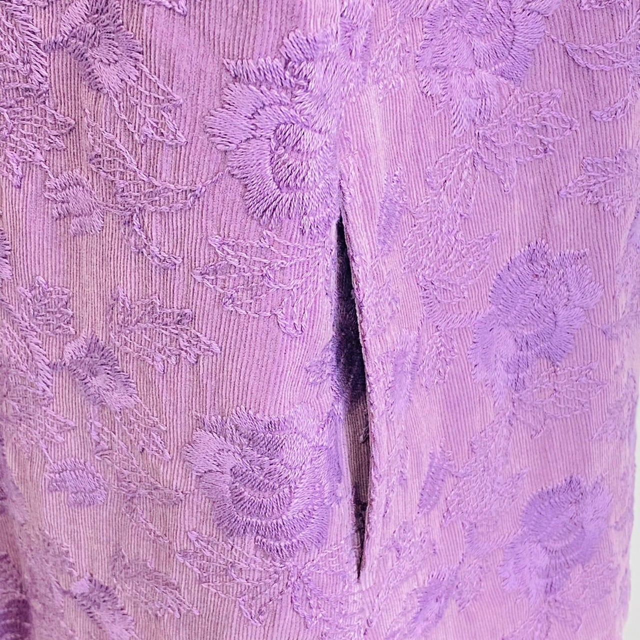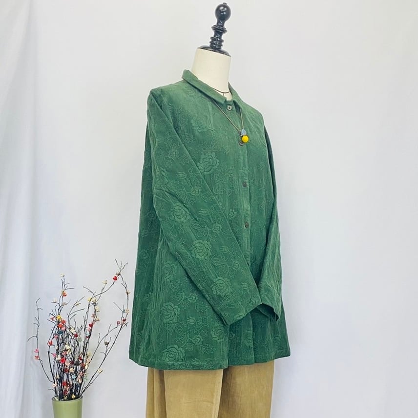 コーデュロイの生地に花柄の刺繍が施された大人可愛いブラウスです。少しAラインになっているのでゆったりと着られます。