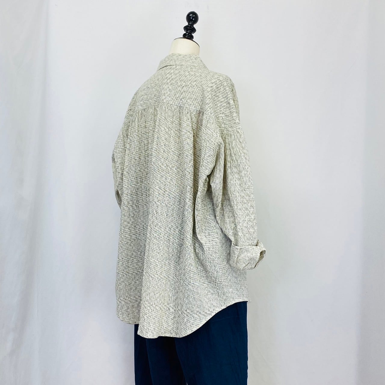 薄手の生地でたっぷりギャザーの入ったペインターシャツを作りました。男女問わずゆったりと着ていただけます。