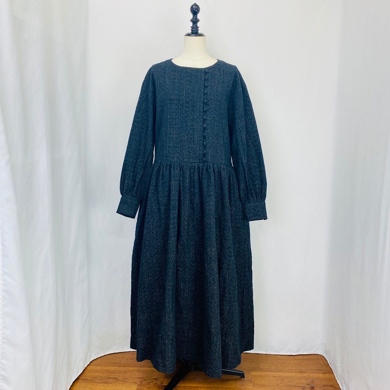小さなくるみボタンをたくさん並べ、ウエストに細かいタックを寄せたロマンチックなロングワンピースです。