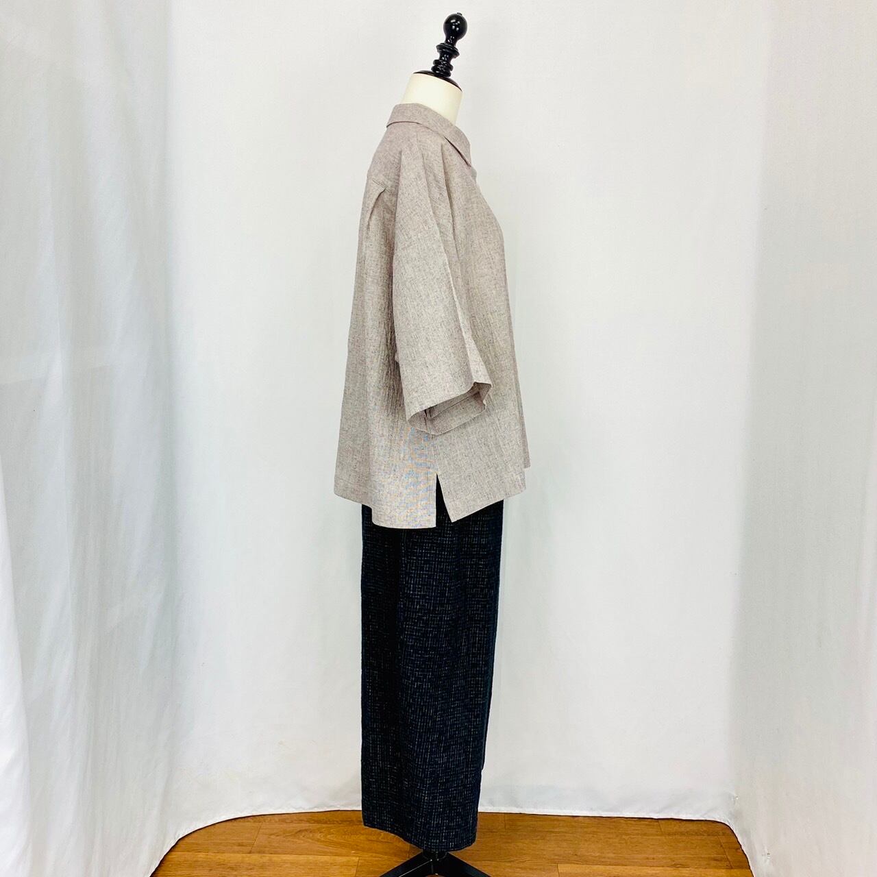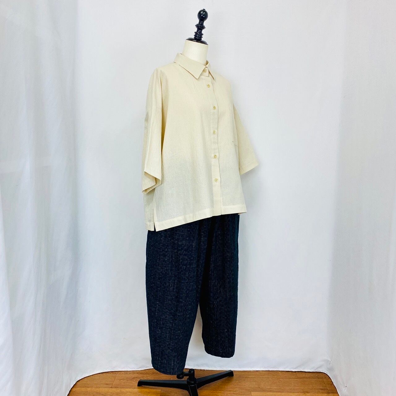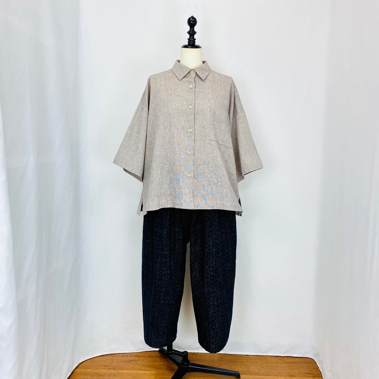 五分袖とヒップ丈の着丈のバランスがいい、襟付きシャツです。