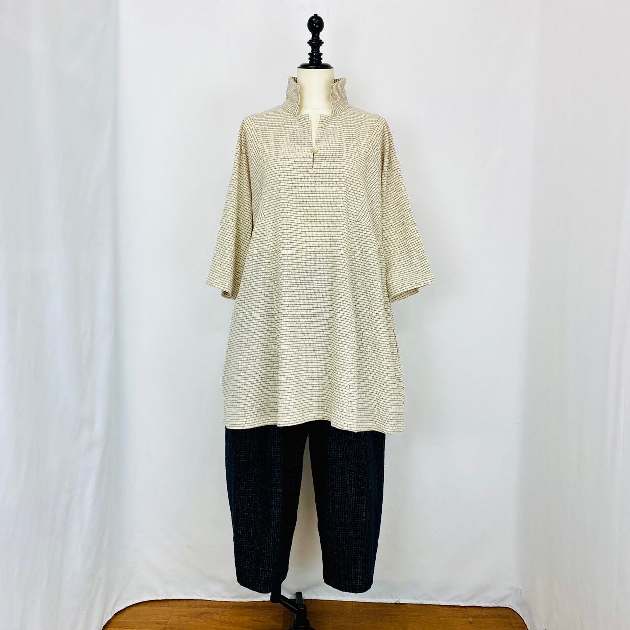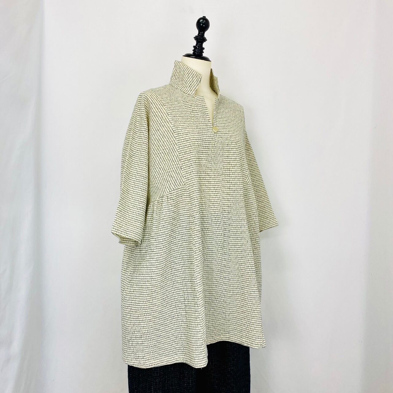 213021 Wギャザー切替えプルオーバー 3カラー 遠州織り 綿シルク絣楊柳ボーダー