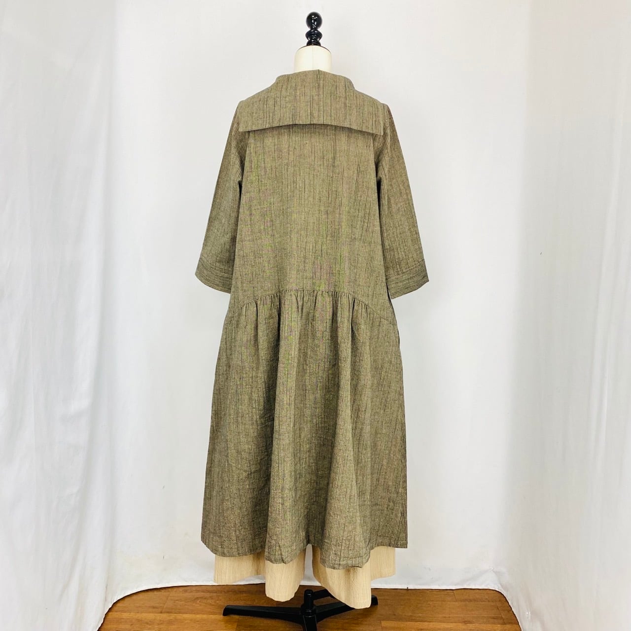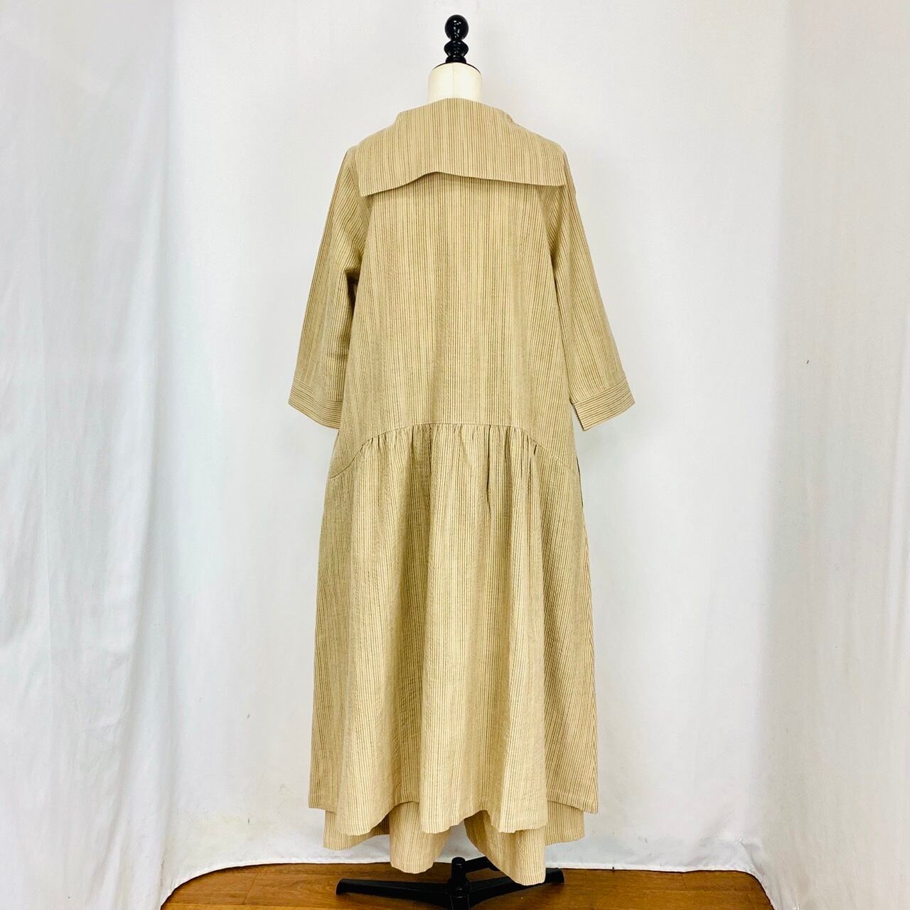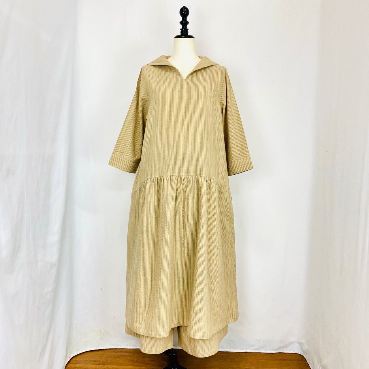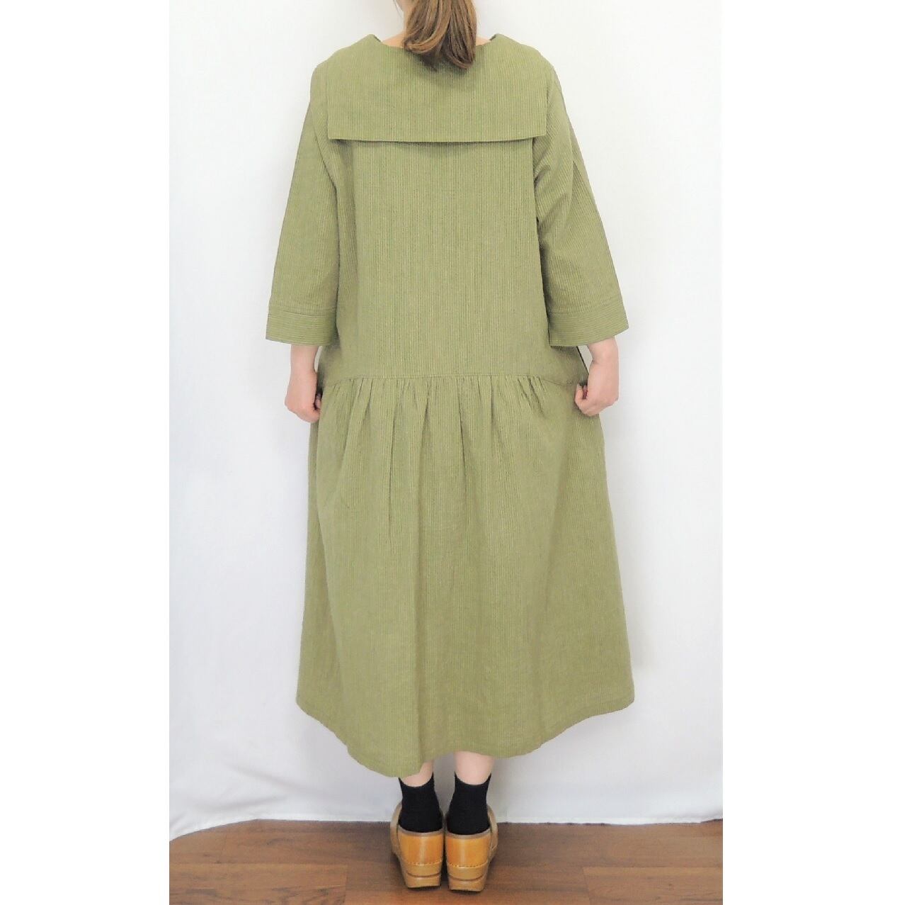 【再販】252010 セーラーカラーの切替ギャザーワンピース 2カラー 遠州織物 逆スラブストライプ うすで